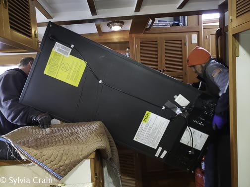 The most essential out of the way, we begin to bring the boxes the marina has been storing back to the boat, making lists of food to buy, figuring out the next task and installing the new refrigerator. The old refer still worked but was 20 years old. Jim wanted a somewhat more efficient model and we found one a little bigger that would fit without changing the cabinetry. We’d bought it in Albuquerque, thus one of the big reasons for the truck and trailer this trip.