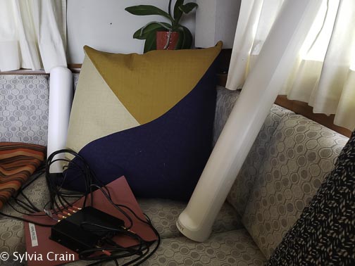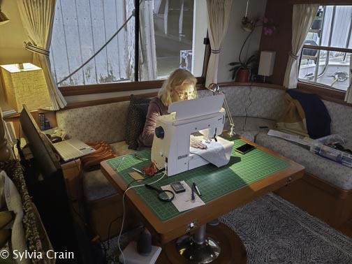 The list of work is still long… While we were gone, we had the cushions in the salon (living room), our bedroom (state room) and pilot house recovered. They were all original and the foam was getting soft and the cushions just dated. We came back to wonderful new cushions! I’ve been busy making pillows which did not get completed at home for a variety of reasons. So lots of boat sewing, cutting, etc.